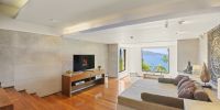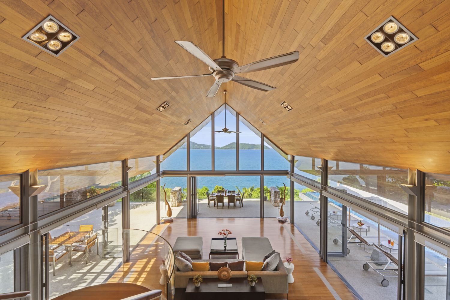Гости спускаются по лестнице в главную гостиную, просторный атриум двойной высоты, окруженный прозрачными стеклянными панелями, из которых открываются панорамы океана и зеленые виды.