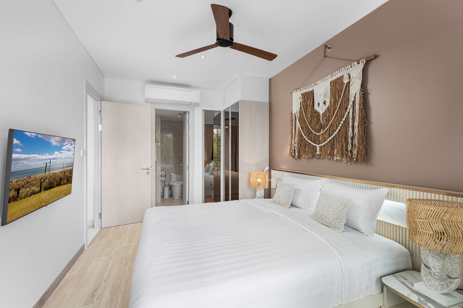Главная спальня, как и вся квартира оформлена в балийском стиле.