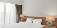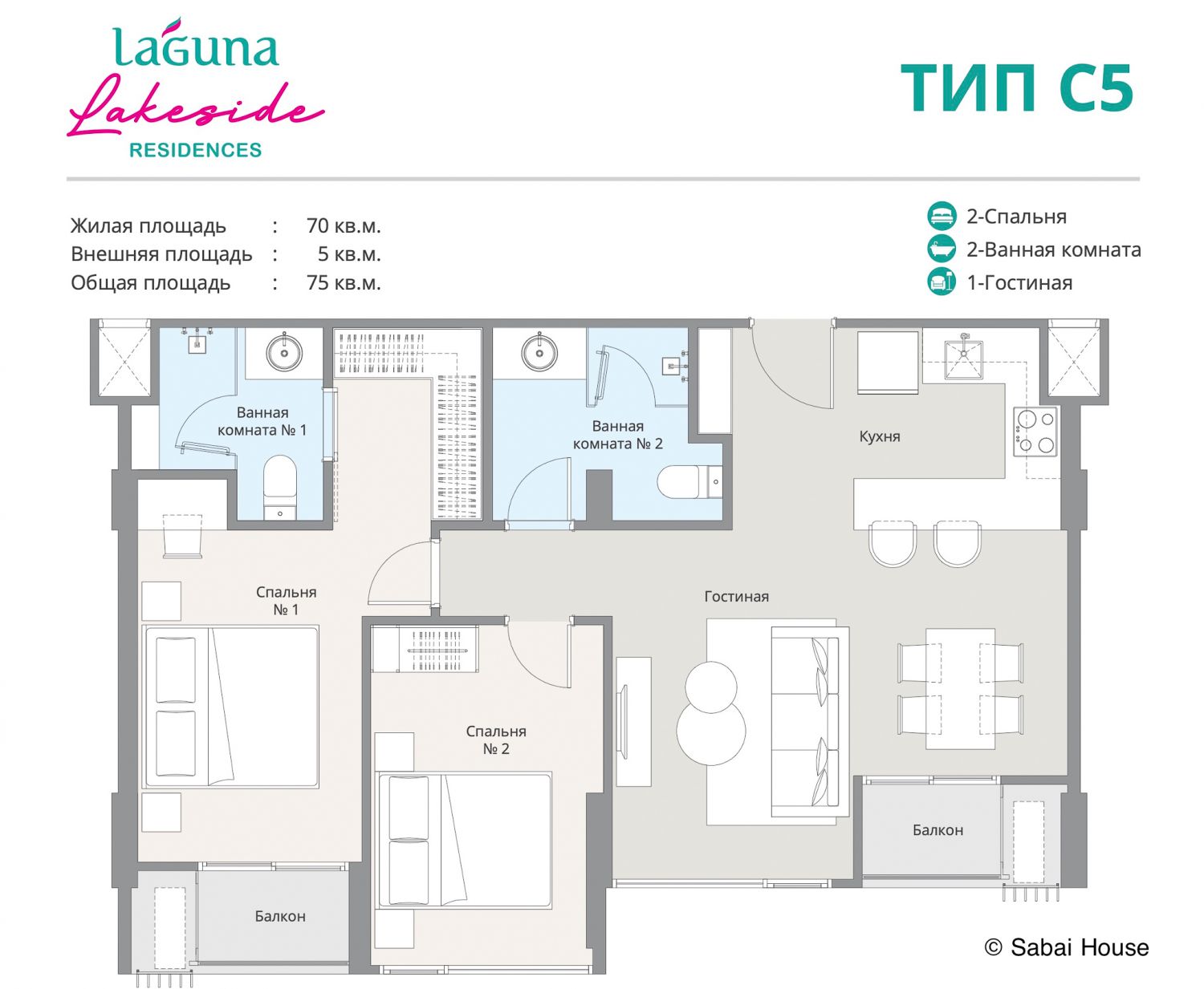 Одна из самых больших квартир по планировке в проекте Laguna Lakeside 1, предлагаемая в аренду на Пхукете с 2 спальнями, 2 балконами и 2 санузлами.